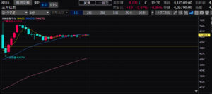 →約定せず。3110円で売り指値注文(10/22)△急激に円安ドル高の傾向が出てきたので、ナイトセッションでかなりあがってきている。急激に円安ドル高の傾向になったからだと推測できるが、ナイトセッションですでに高値圏にあるので、PTSの価格をもとにして、前回の高値付近で利確いすることにした。