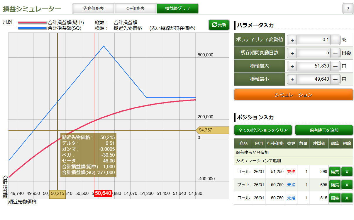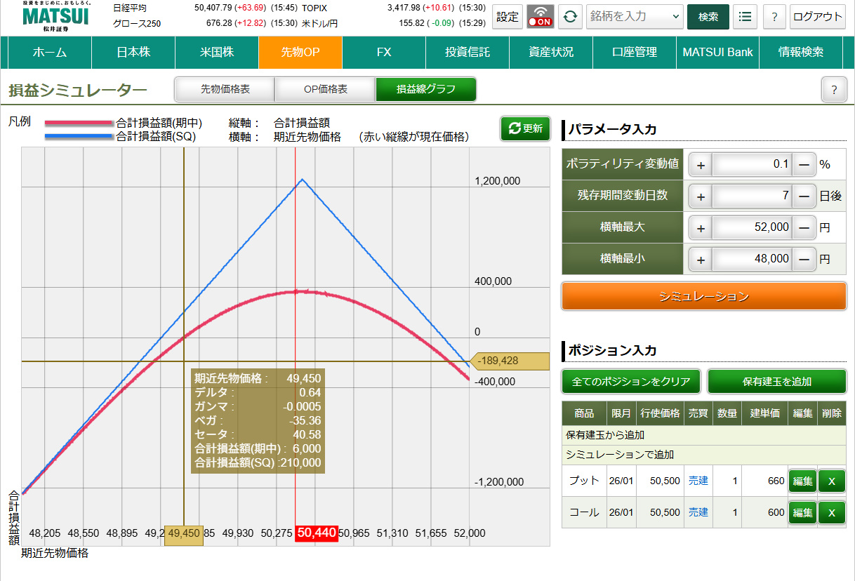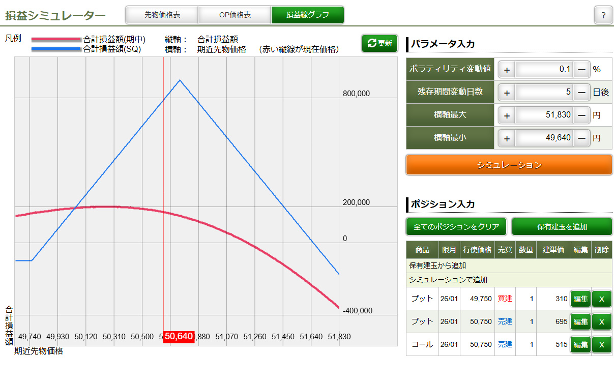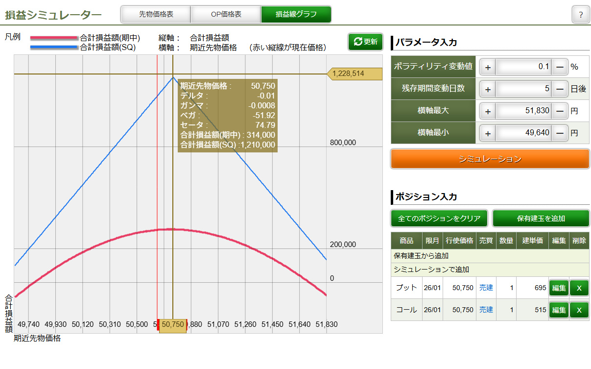 値がまったく上下にブレず、行使価格とほぼ同等になった場合が最大利益(期中/31万4000円、SQ/121万円)下落した場合の損益分岐点が「49765円」、対して上昇した場合の損席分岐点は「51205円」となった