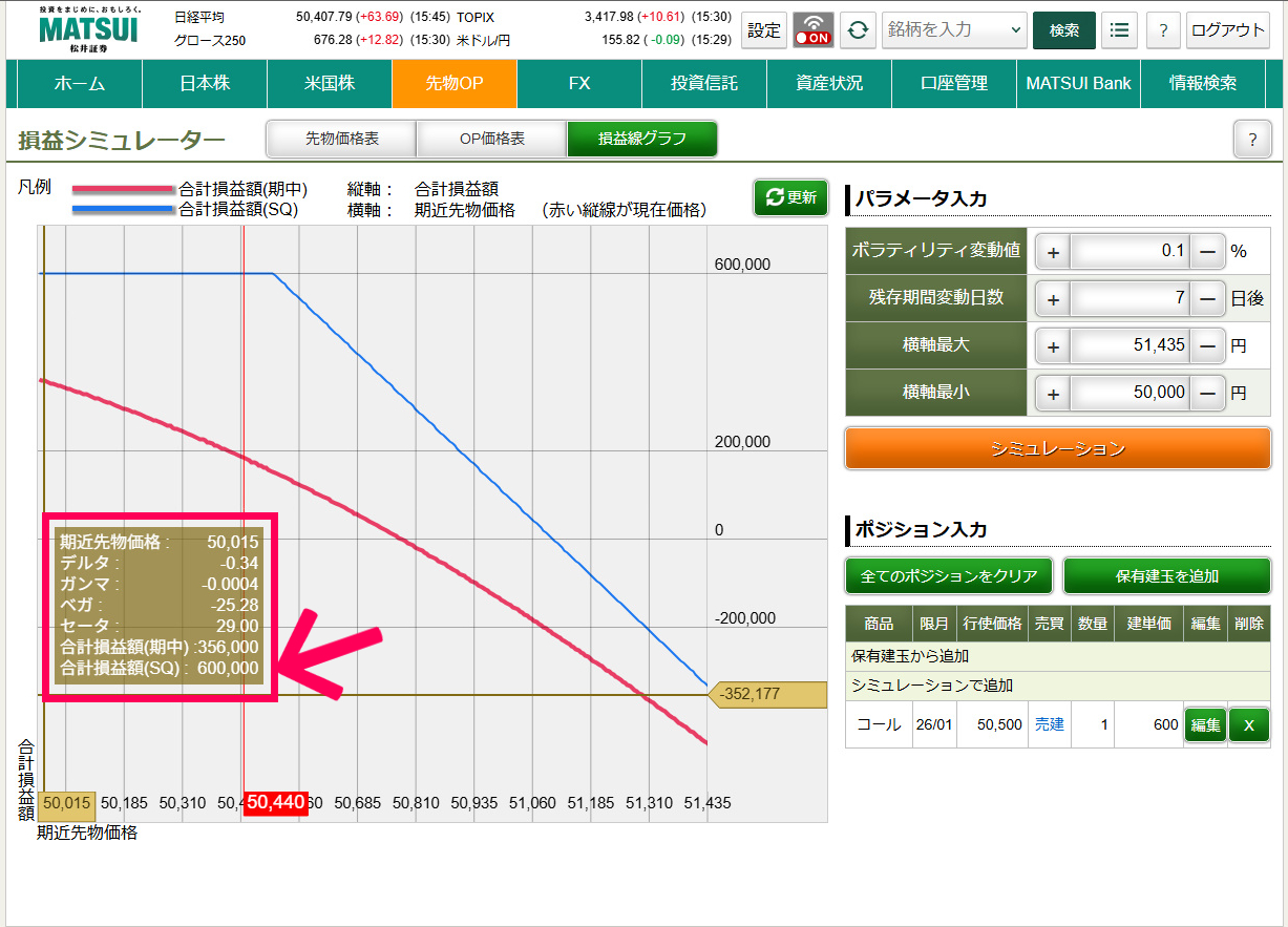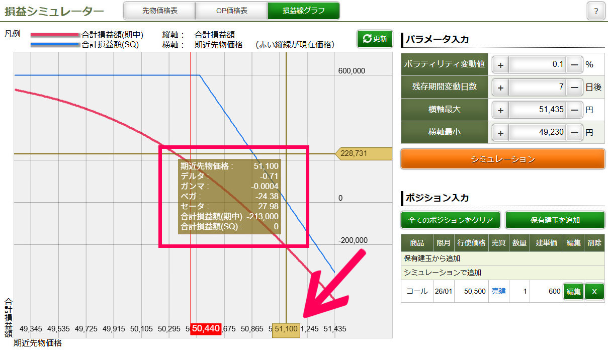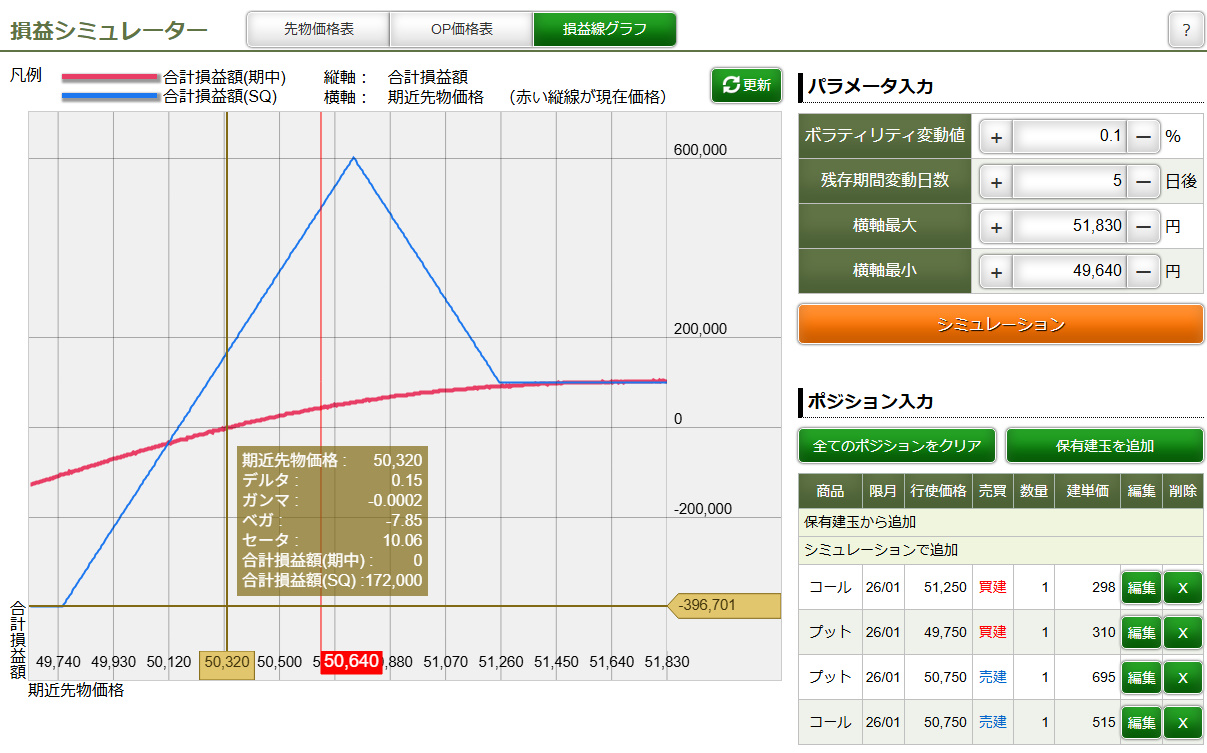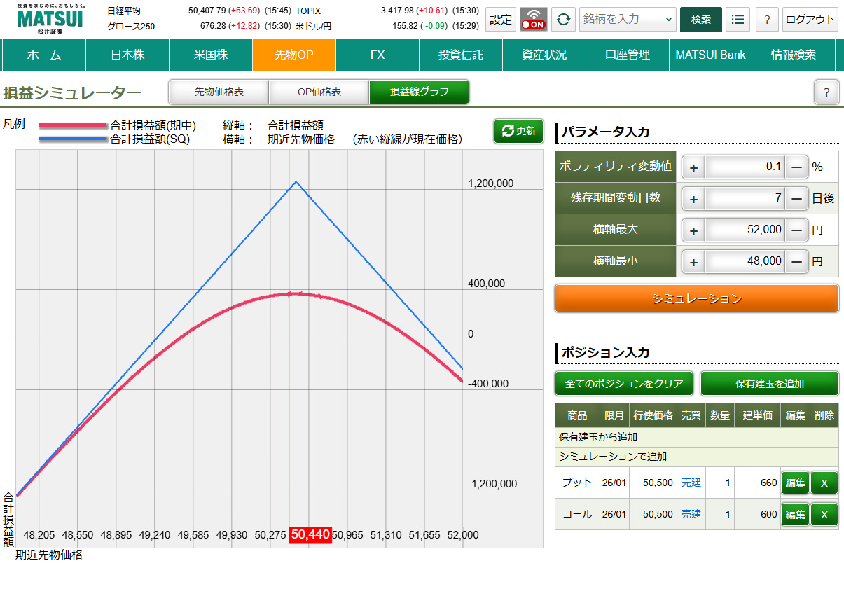 値がまったく上下にブレず、行使価格とほぼ同等になった場合が最大利益(期中/31万4000円、SQ/121万円)下落した場合の損益分岐点が「49765円」、対して上昇した場合の損席分岐点は「51205円」となった