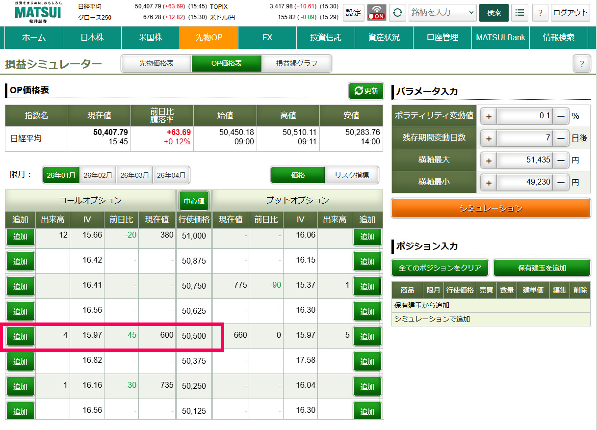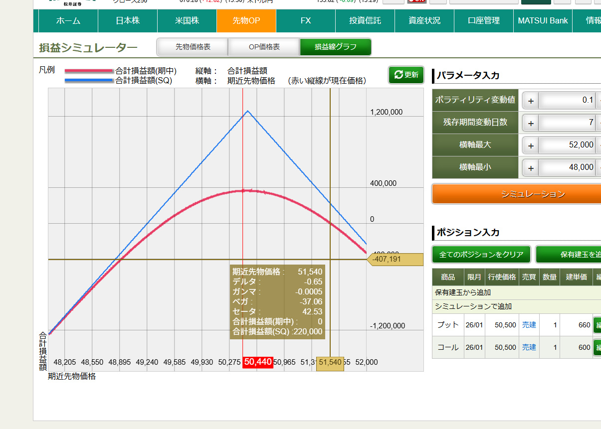 行使価格50750円で「プット・売り、コール・売り」。この2つで検証