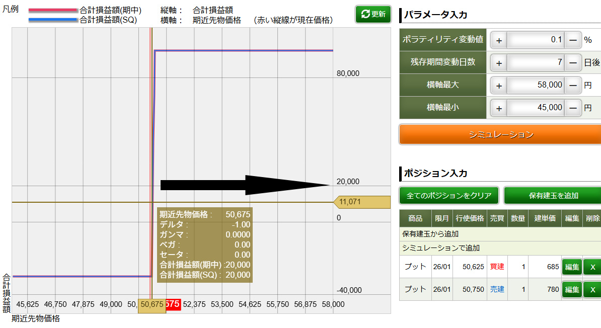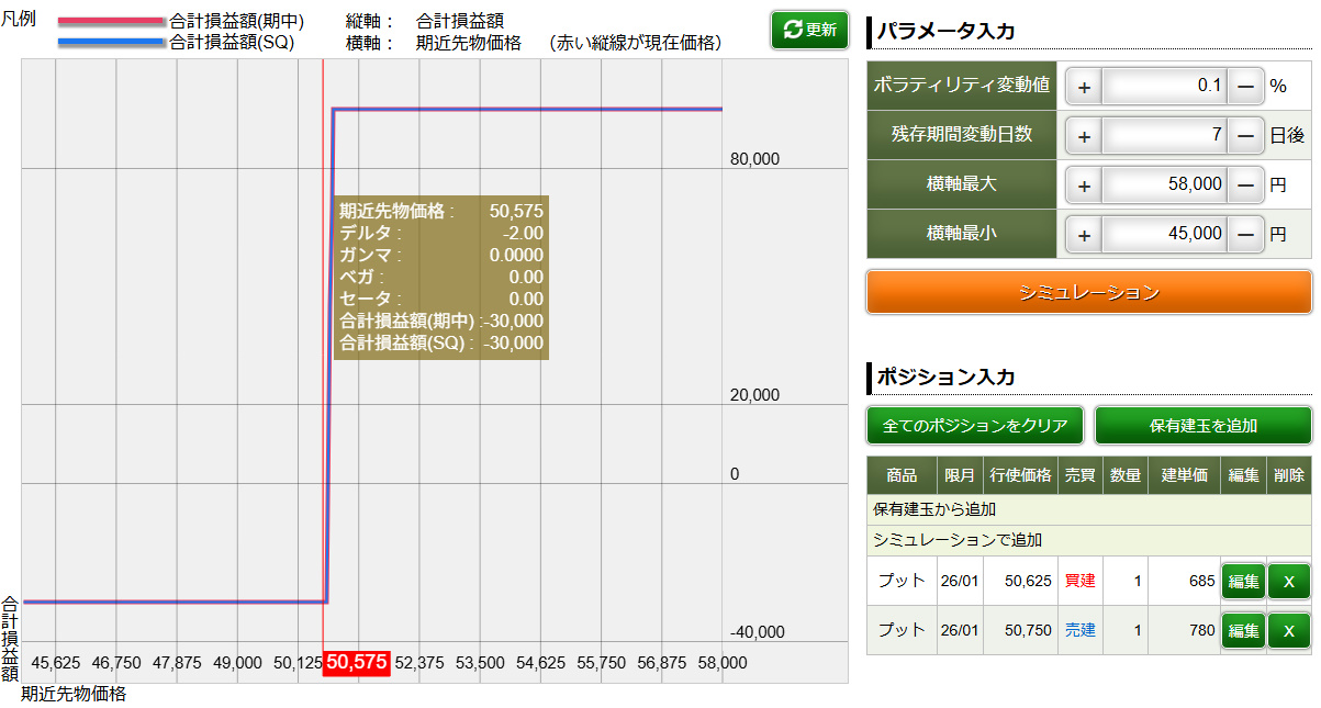 相場が予想とは逆方向にいってしまっても損失が限定されるし、予想が的中し、上昇したときには「プット売りポジション」が力を発揮して含み益を増加されてくれる。戦略としては無難で良い方法だと思う。