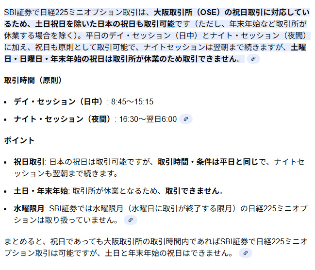 SBI証券の日経225ミニオプションでは「土日」の取引はできない。ただし、「祝日」は可能。