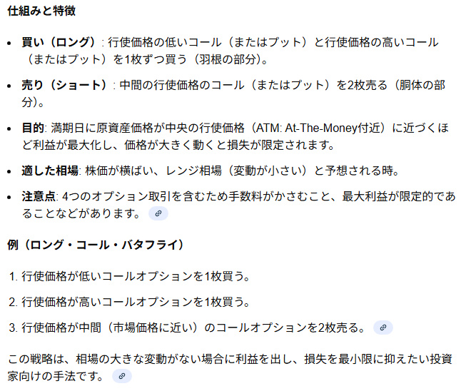 1.ロング・バタフライ(Long Butterfly)とは、オプション取引の戦略の一つで、原資産価格の変動が小さい(相場が膠着する)と予想される時に用います。具体的には、行使価格の低いオプションと高いオプションを買い、その中間の行使価格のオプションを2つ売る(あるいはその逆の「ショート・バタフライ」)ことで、リスクを限定しつつ、価格があまり動かない場合に利益を狙う戦略です。損益図が蝶が羽を広げたような形になるのが特徴です。