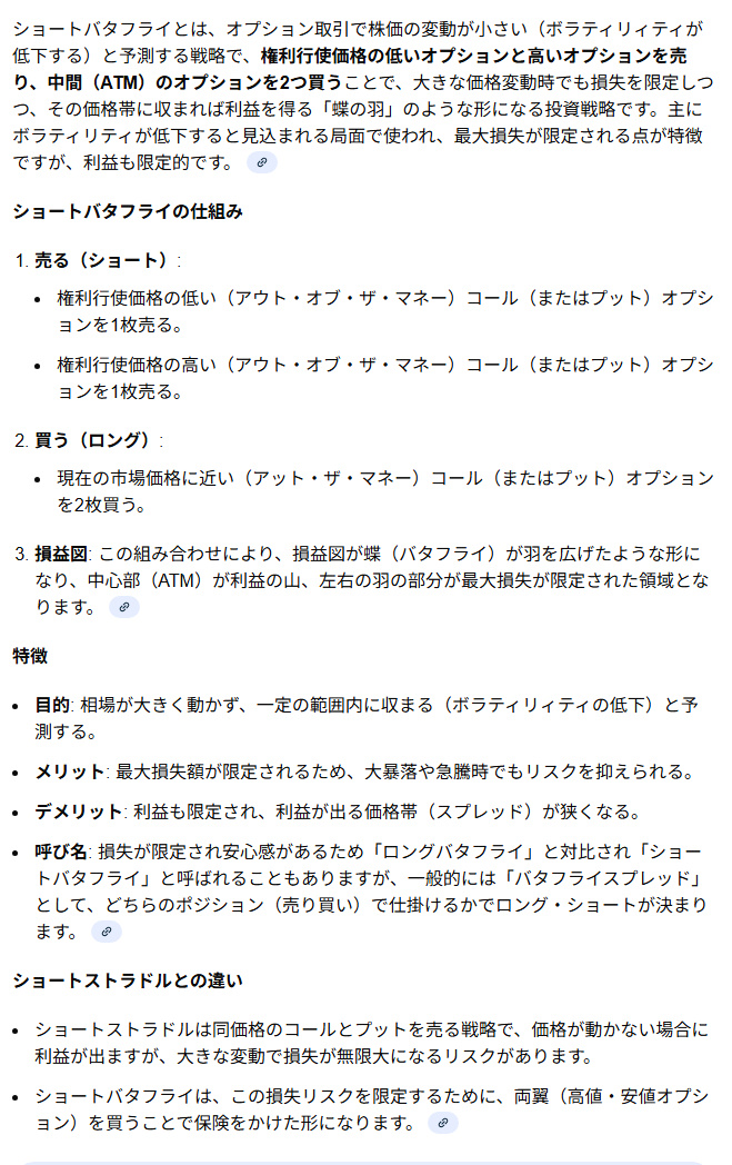 ロング・バタフライ、ショート・バタフライ、ロング・アイアン・バタフライ、ショート・アイアン・バタフライは、オプション取引で使われる戦略の名前で、原資産(株価など)が特定の価格帯で推移する(レンジ内にとどまる)と予想し、リスクを限定しながら利益を狙うための手法です。これらは、中心の価格(ATMなど)でオプションを「売る」ことと、「買う」ことの組み合わせで構成され、損益図が蝶の羽のような形になることから「バタフライ」と呼ばれ、売買するオプションの種類や枚数、範囲によって名称が異なります。