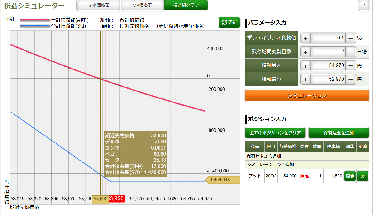 ※あくまでも「ミニオプション取引」を想定。損益シミュレーターは「ラージ(✕1000倍)」を基に表示されているので、一桁減らして考える。