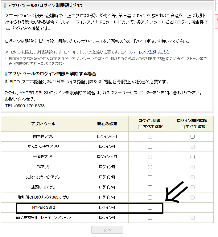 オペレーターの方の指示に従って、この中の一番下の項目「アプリ・ツールのログイン制限設定」の「変更」リンクをクリックして、さらにどのようになっているのかを確認しました。すると「HIPER SBI 2」の項目がログイン不可に。これは元々はログイン可になっていたはずで、制限がかかりツール自体にロックがかかったために「ログイン不可」になったのだと思う。(画像は問題解決時のものなので、すでにログイン可になっていますが)