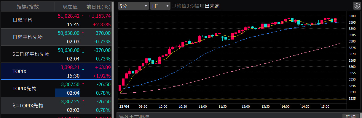 日経平均株価とトピックスは、このところ真逆の動きをしていることも会ったが、本日は珍しく綺麗に同じで右上めがけてほぼ一直線