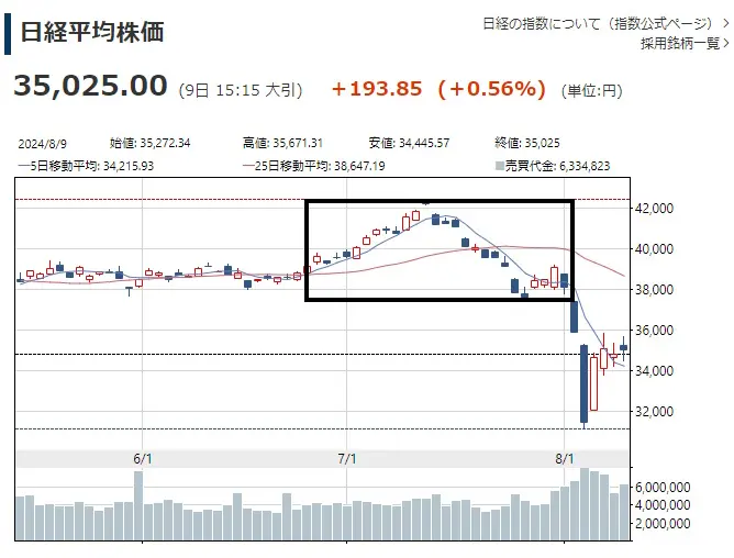 黒色で囲った線が、17銘柄を購入した時期。最後の二銘柄(ほくほくフィナンシャルと秋田銀行)の株は、植田総裁による”利上げ”記者会見のあった翌日。この日は、前日の利上げ会見の影響もあり、銀行株はほとんどが軒並み上昇した(上がらなかったのはほんの一部にすぎない)。そのこともあり、銀行株は”今が買い時”だと判断した。結論的に考えると、「植田ショック」が起こる5日(月)の直前まで株式を買い集めていたことになる。最後の二銘柄(ほくほくと秋田銀行)を除けば、他の複数銘柄に関しては7月19日(月)に購入した(大和ハウス工業とABCマート)が最後になる。日経株価の値動きに怪しい雲行きが現れはじめたのは25日に大きく下げたとき。このときの下げはそれなりに大きかったが、特に驚きに値するものではなく、これまでの動きと同じような感覚で誰しもが見ていたと思う。なので、これが「植田ショック」がはじまる直前の兆候だとは誰も気づいていないはずだし、自分もそんなことは考えてもいなかった。事実、7月29日から31日までは少しづつだが株価は上がっている。