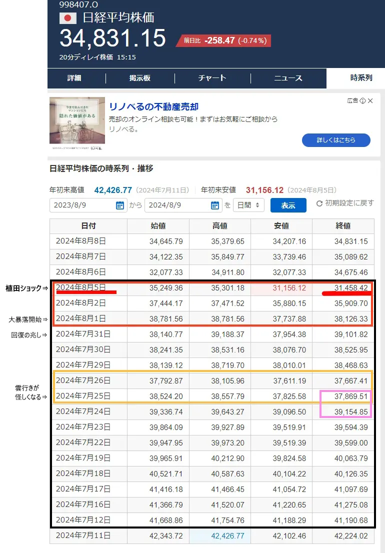△また「ほくほく」と「秋田銀行」を除けば、日経平均株価も7月19日までは4万円台をキープしている。7月19日といえば、大和ハウス工業とABCマートの株を100株づつ買い注文を入れた日であって、 やはり考えてみれば『過去最大の下げ幅を記録する大暴落』など、ほとんど予測不可能であったと結論付けることができるかと。
